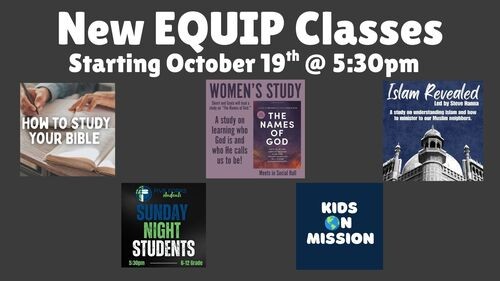 Bible study doesn’t just happen on Sunday morning. EQUIP Classes are weekly Bible studies that create an opportunity to be strengthened in your faith and in the knowledge of God’s Word. These classes are short-term and often seasonal. Classes meet on Sunday nights from 5:30pm - 6:30pm.